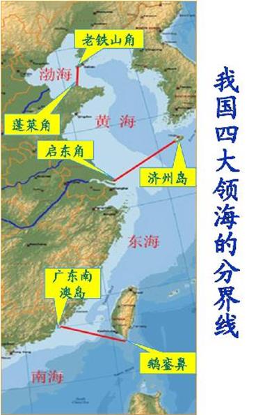 中国四大海域的分界线:渤海与黄海:辽东半岛南端老铁山角与山东半岛北岸蓬莱角的连线;