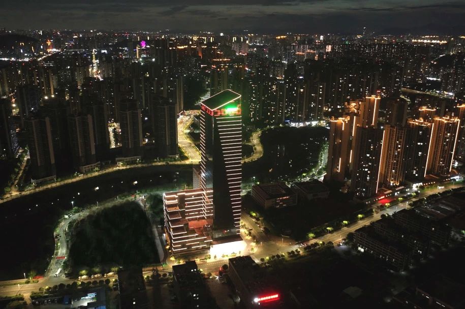 大厦外立面设计幕墙泛光照明系统,缔造大亚湾CBD封面形象,以光影线条元素勾勒建筑形体,礼献高颜值企业形象,赋予城市建筑夜间生命意境。