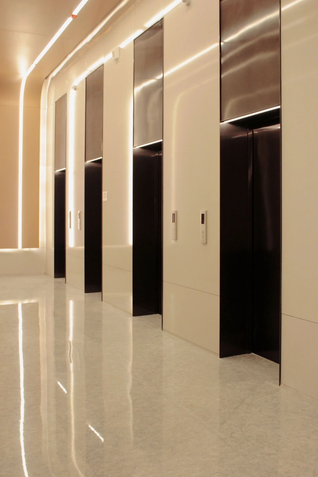 A、B座共配备了13部德国进口蒂森克虏伯电梯,A座包含7部客梯、1部VIP梯和1部消防梯。采用高低分区运行模式,运行速度达到4m/s,充足的电梯数量和高速运行将大大减少等候时间,保证在高峰时期电梯无需排队。1部VIP梯供企业总裁和VIP客户使用,满足尊贵乘梯体验和高规格接待需求。