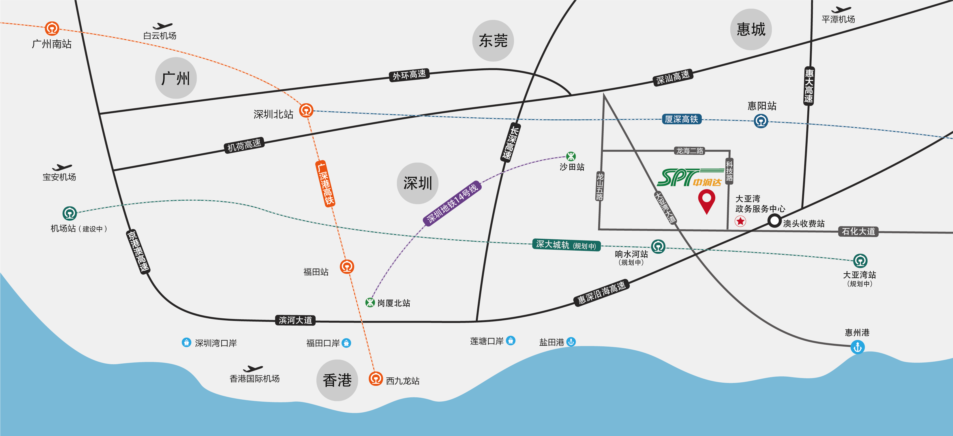 九游娱乐(中国)官方网站大厦东瞰惠深沿海高速,南接石化大道,西邻大亚湾大道,北近龙海二路;距惠深沿海高速澳头出口约500米,可与深汕高速、惠大高速连通出行;距厦深高铁惠阳站约10分钟车程,可实现一站入深,一小时直通香港;距惠州平潭机场候机楼仅100米,距深大城际轨道大亚湾段响水河站约1.5公里,可搭乘多条航线,快速高效通达全国、连通全球。
