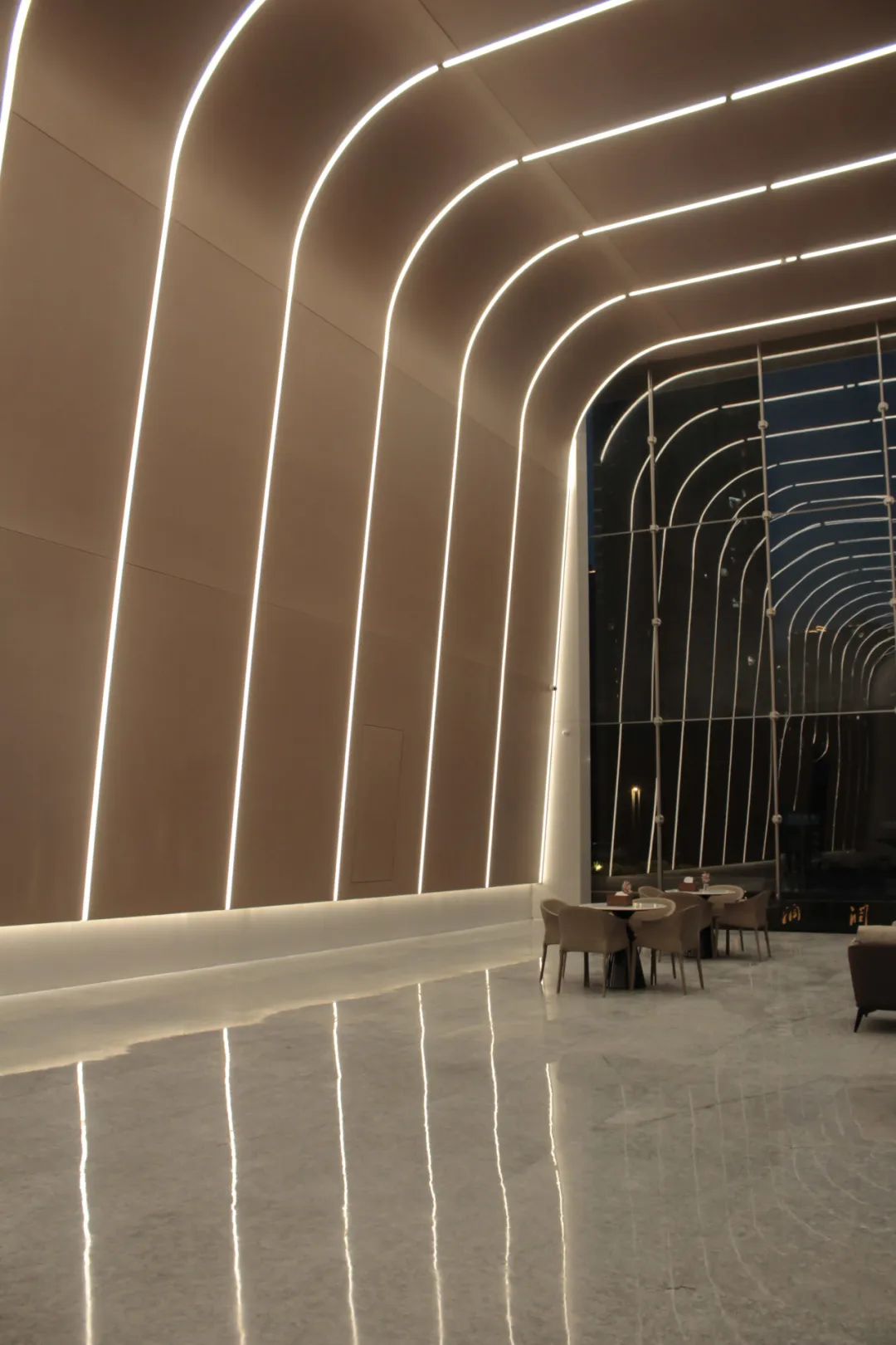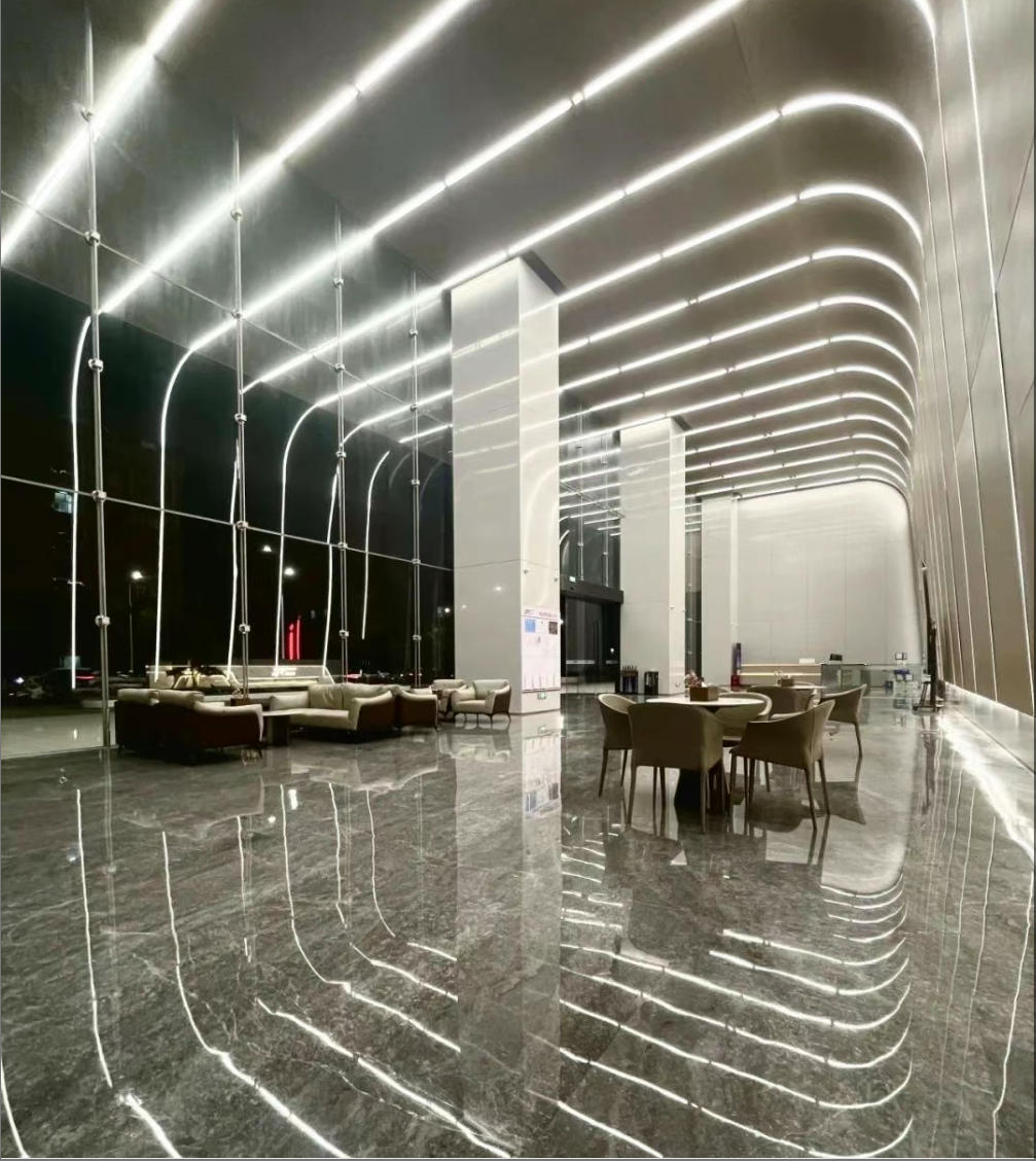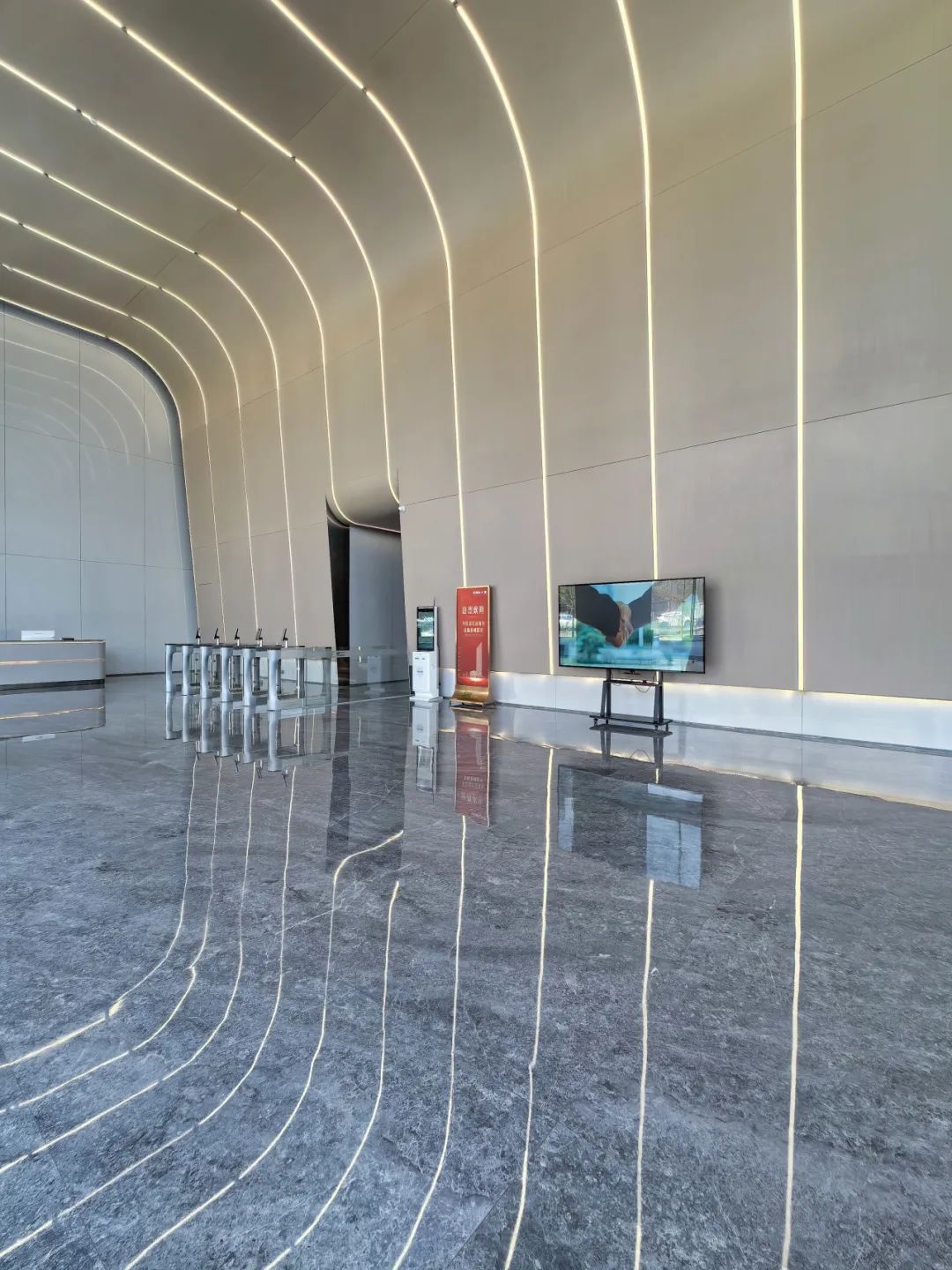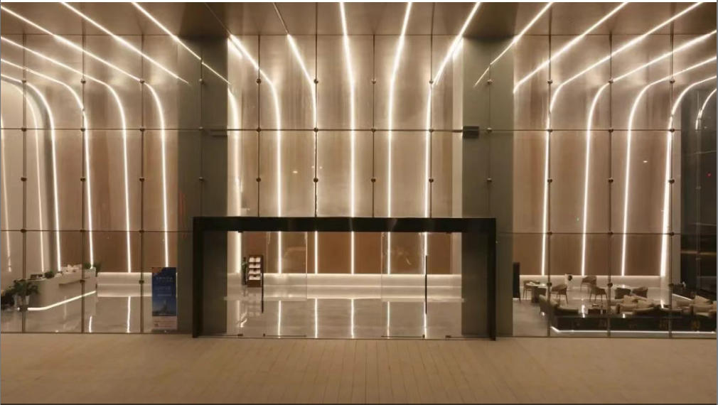 大堂采用弧面线条灯带式设计,